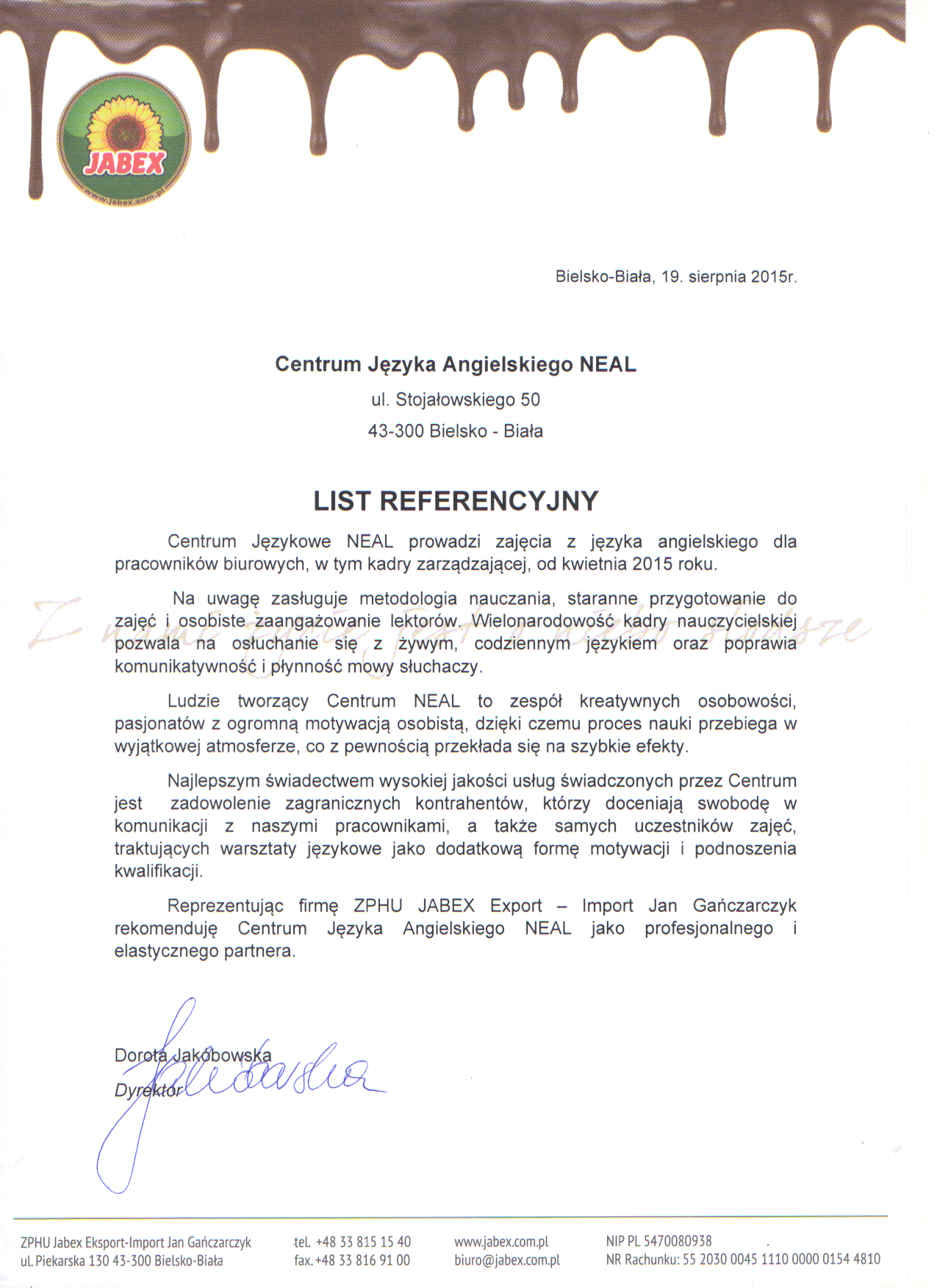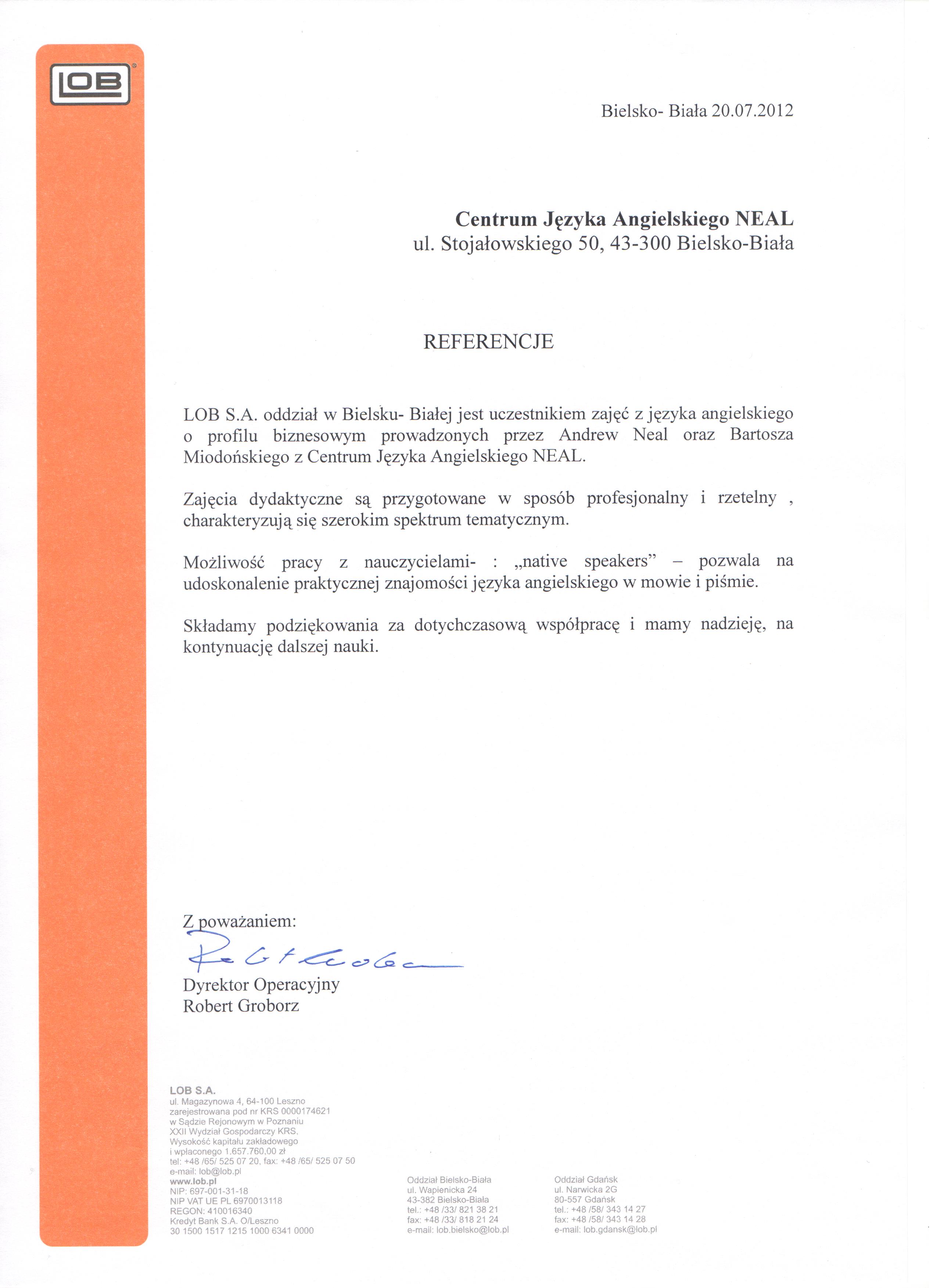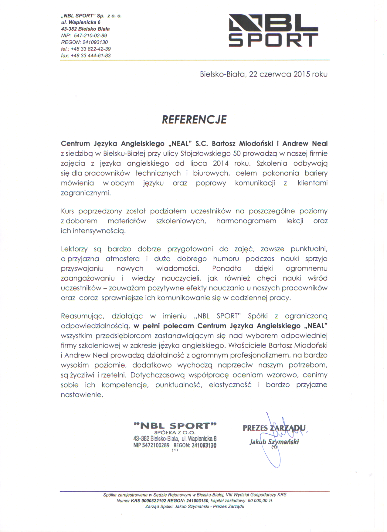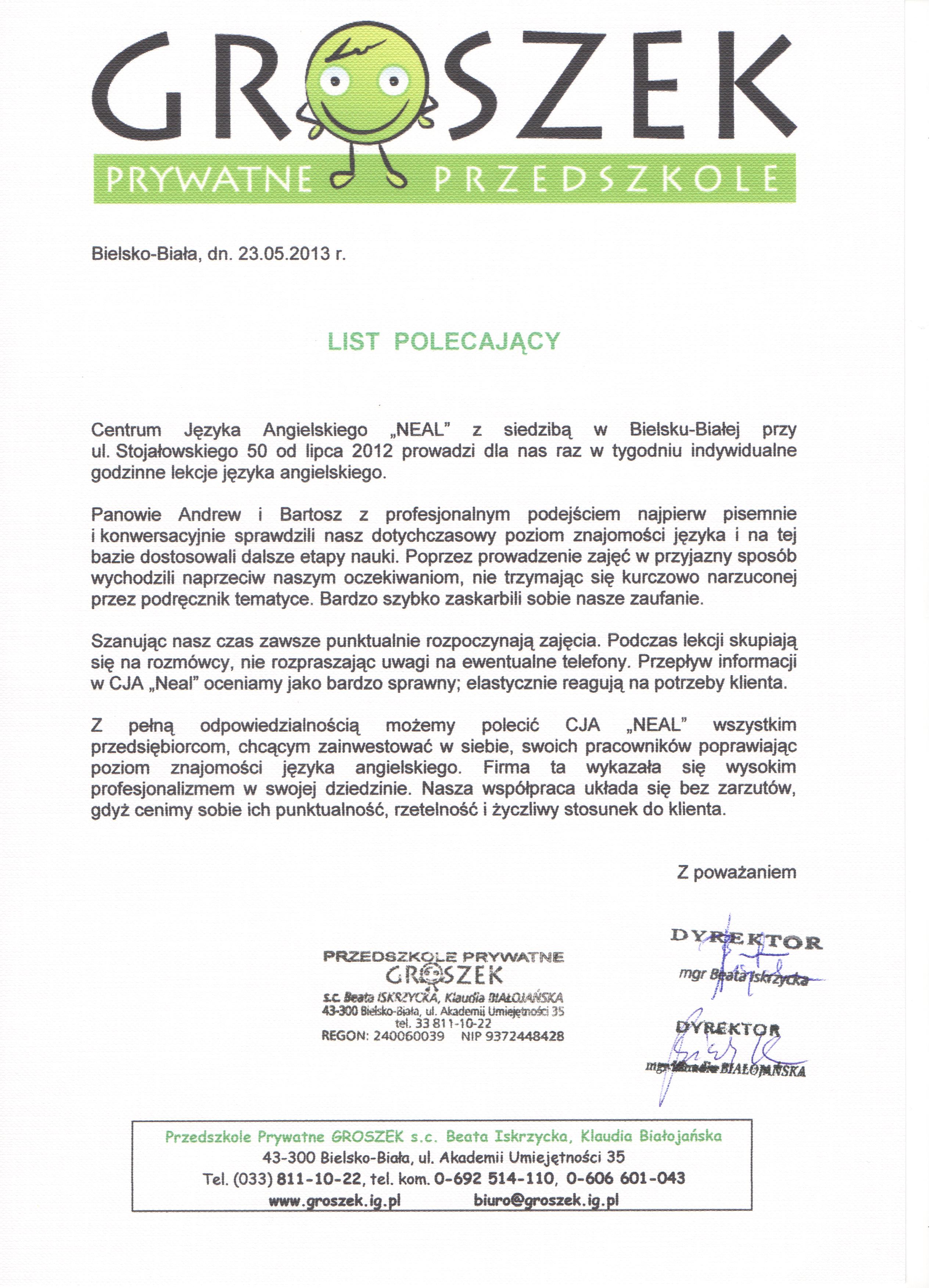 Zajęcia mogą odbywać się na terenie Państwa Firmy lub w siedzibie Centrum Języka Angielskiego NEAL w grupach zamkniętych lub otwartych.